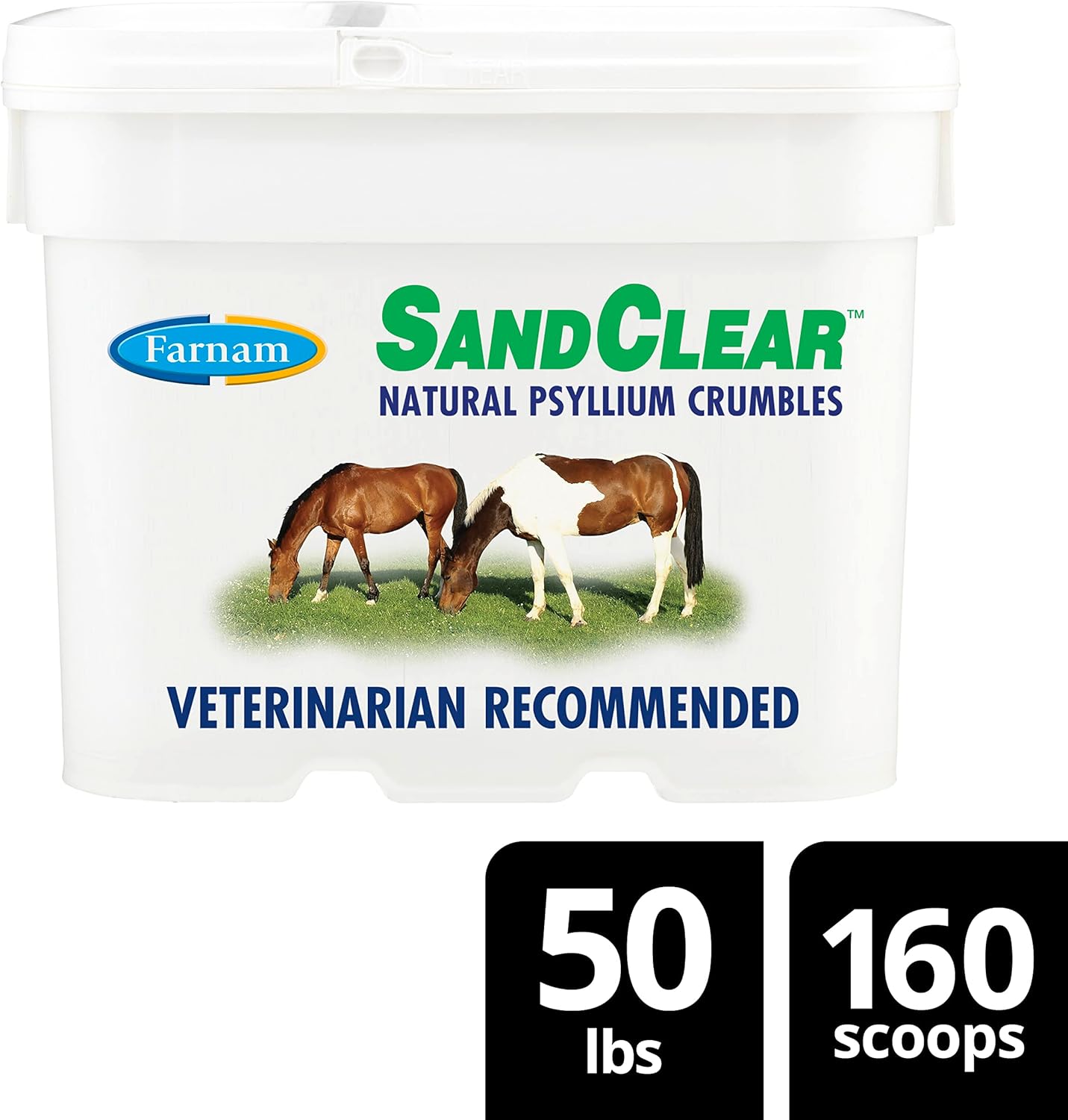 Sand impactions can occur when a horse ingests sand or soil particles, either accidentally or intentionally. Many horses ingest small amounts of sand without harm, but if the volume is high enough, the excess sand may congregate in the horse’s intestinal tract and can cause an obstruction. The incidence of excess sand in the gut is often thought of being limited to horses in sandy areas or regions, but horses can have bouts of sand colic regardless of geographic location and even if they’re grazing on pastures. Sand and dirt hide in unexpected places like hay bales, grass pastures, and your horse. Help reduce the possibility of sand colic in horses with SandClear Crumbles. SandClear Crumbles is formulated with a premium psyllium husk to support the removal of sand and dirt from the ventral colon. Ideal for horses that live in sandy regions, are turned out on overgrazed pastures, eat hay off the ground, or habitually consume sand due to boredom. This palatable, apple & molasses flavored psyllium supplement is backed by veterinarians for horses of all ages, including foals.