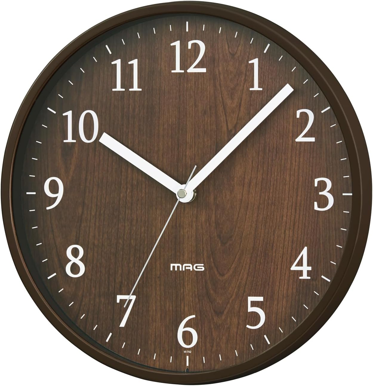 Wood-style wall clock that fits interior with a diameter of about 9.8 inches (25 cm). Minimize decoration and simple design for easy viewing Adopts a continuous second hand, so it can be used in a quiet bedroom.