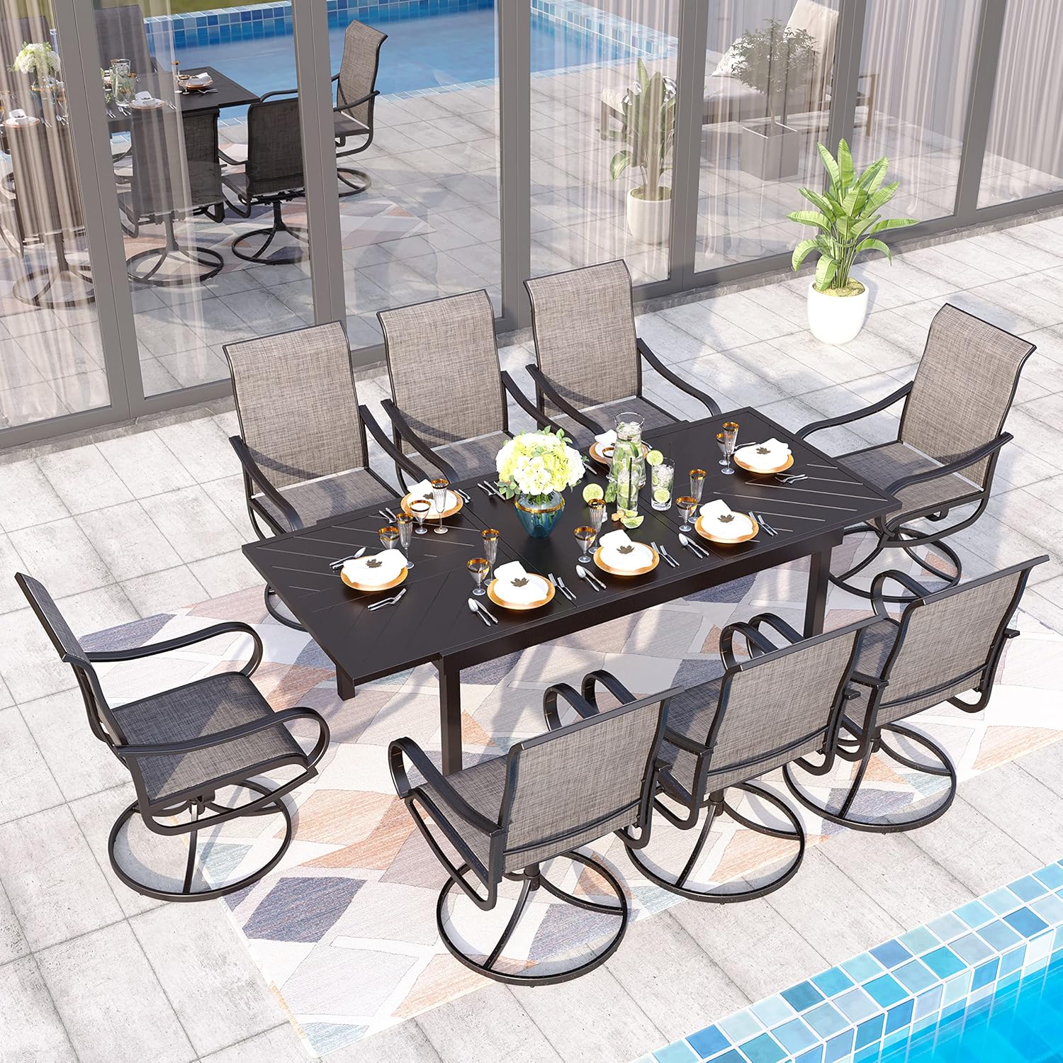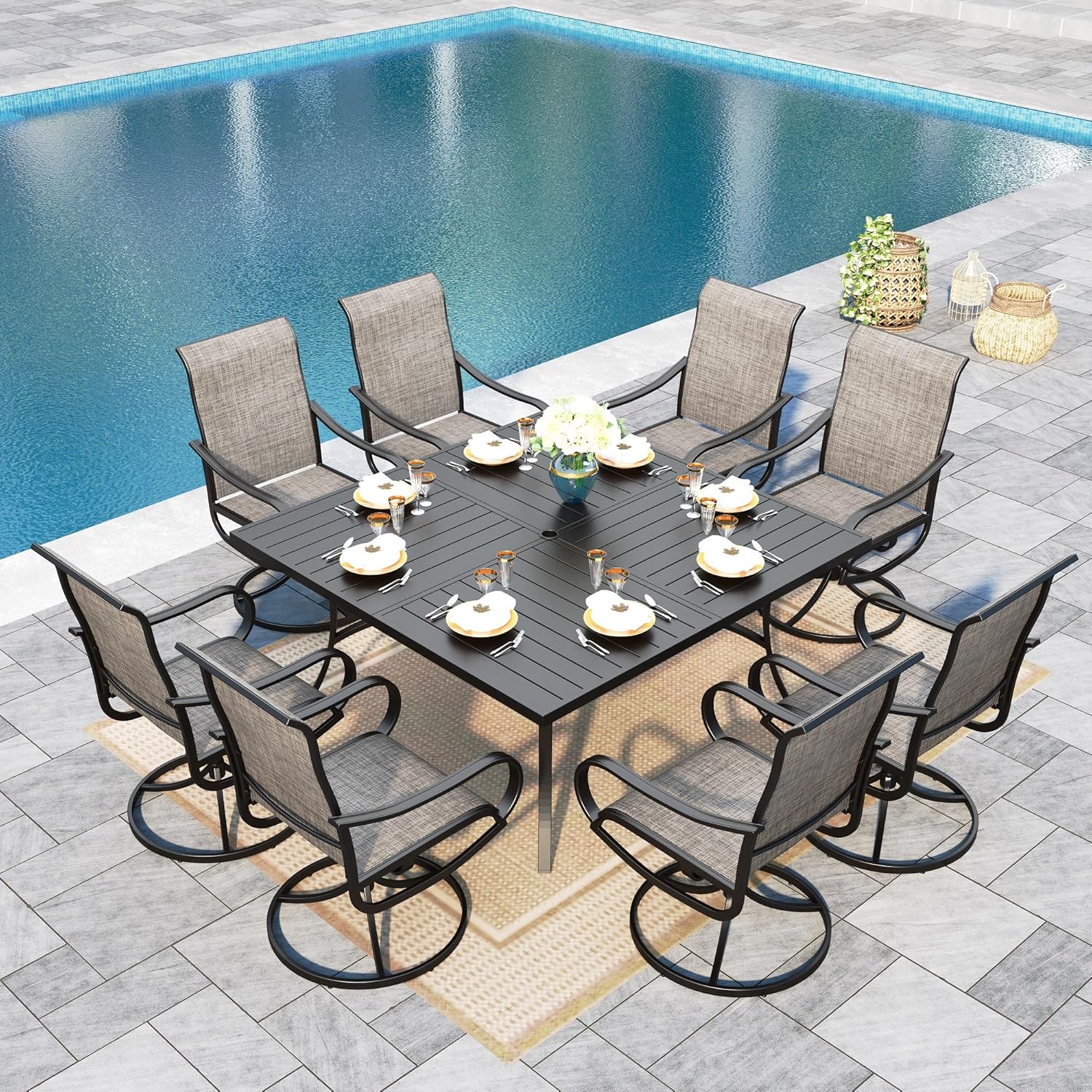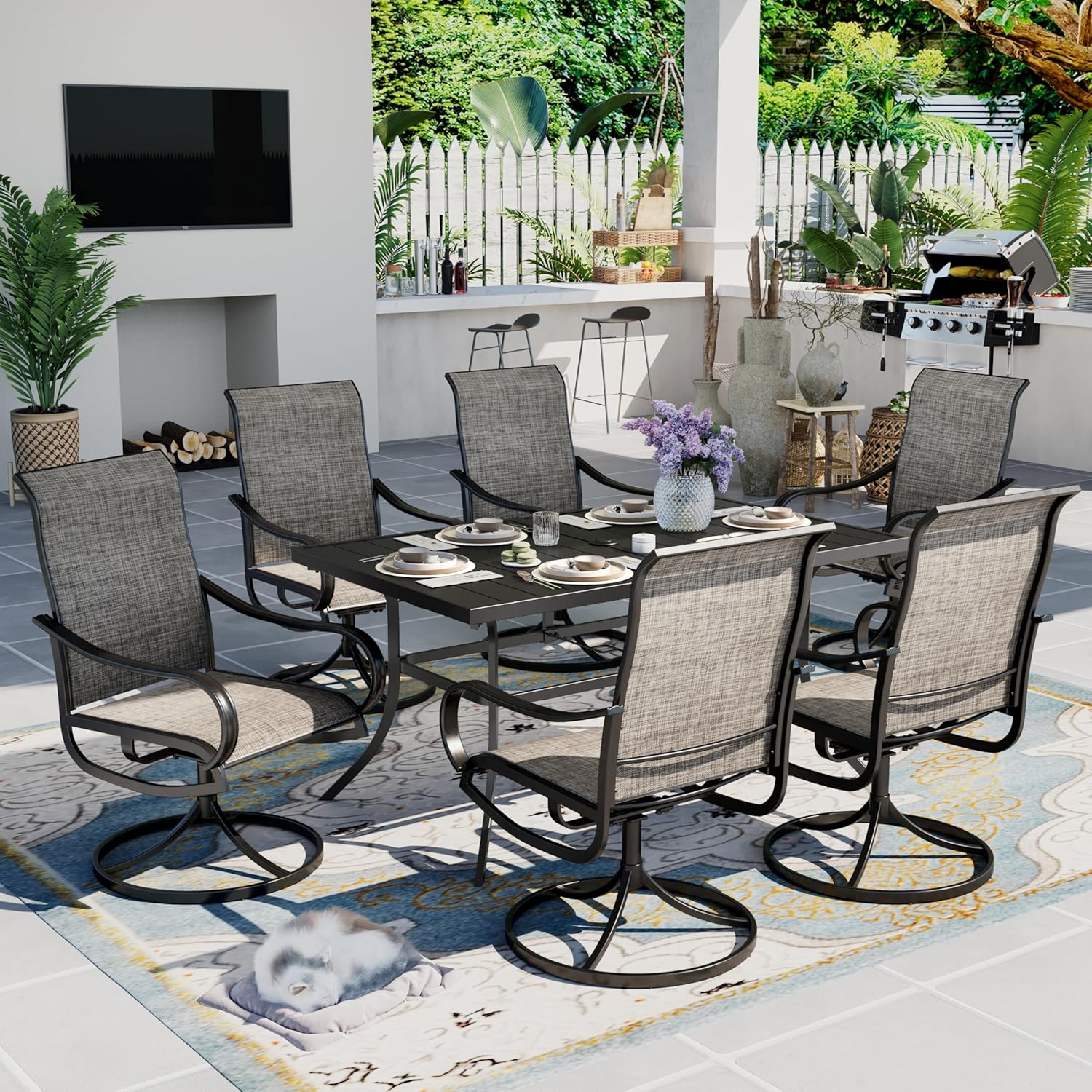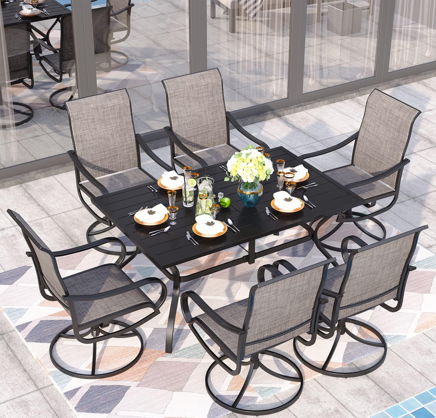 • E-coating Technology: Our furniture is coated with advanced E-coating technology, ensuring superior durability and a longer lifespan. The set includes a 4-person dining table paired with swivel chairs, making it perfect for a family of four. Enjoy the outdoors with this durable and stylish set that's designed to last