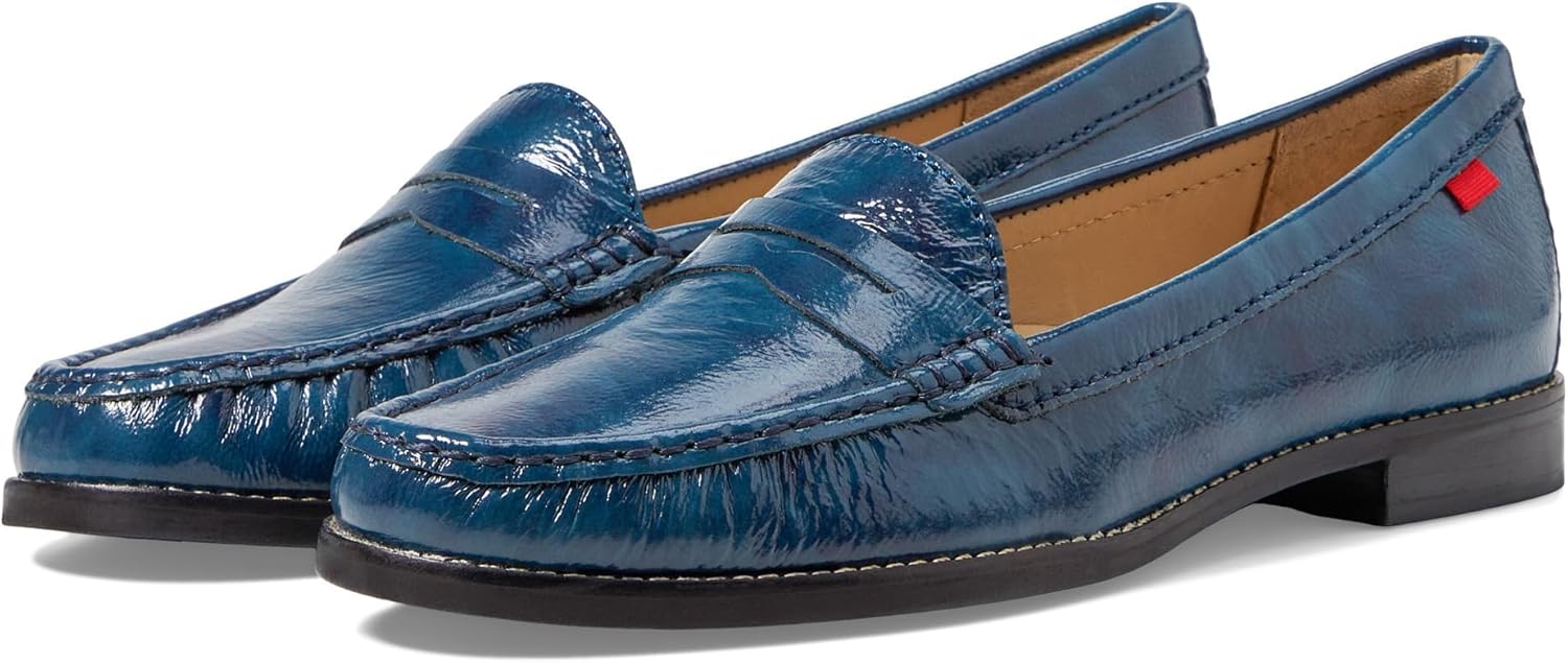This classic and chic penny loafer is a must have for any wardrobe. Its luxe patent leather gives this loafer the perfect sheen to complement any ensemble. Its durable rubber sole and half inch stacked wooden heel combined with its padded footbed and blunt arch support provide for excellent comfort and durability.